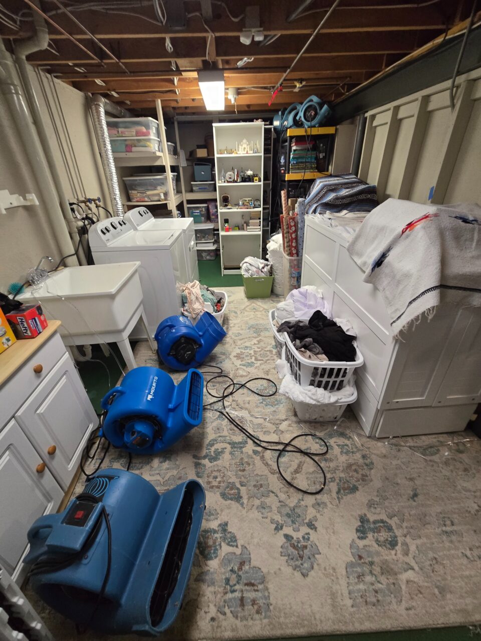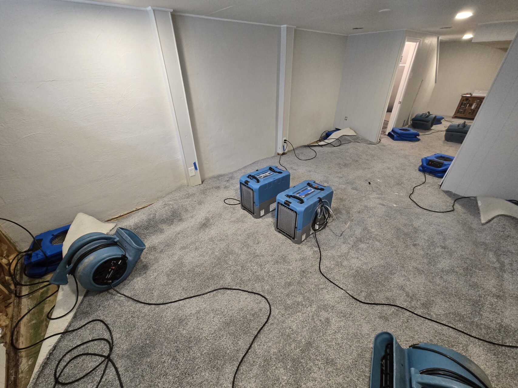 The homeowner discovered signs of water intrusion—discolored drywall, saturated carpet, and puddling near the base of a basement wall—on the holiday afternoon. Recognizing the risk of secondary damage (mold, structural weakening, carpet delamination), our team mobilized quickly. We performed water extraction, set up structural drying equipment (air movers, dehumidifiers), and began monitoring moisture levels. By acting immediately, we limited the spread of moisture and prevented further damage to finishes and belongings.